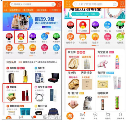 据手淘APP改版前的页面显示,聚划算分别在首页的功能区域和“淘宝头条”下方有两个入口。