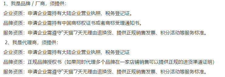 再然后,就是大家非常关心的想要入驻天猫的一系列的要求了,如下图所示: