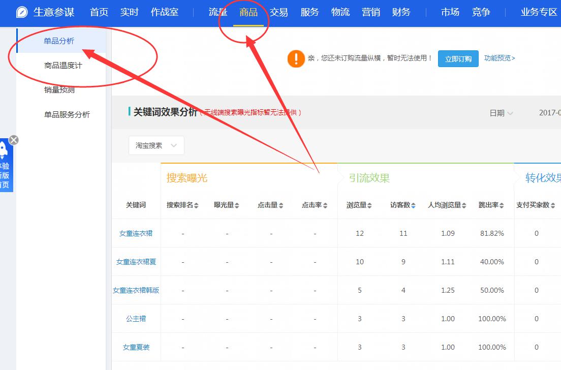 而强化产品群标签,首先要学会的是通过生意参谋的单品分析来看一下产品的竞争关键词,精准的关键词是要找的产品自身有的关键词数据,因为通过寻找到数据最好权重最大的关键词。来确定产品说针对性的人群,而且有人群就需要通过关键词来进行体现出来,比如说大码连衣裙,像这样的关键词能够凸显出来的人群非常的精准,通过这些人群来断定他们想要的是什么,想要的是透气还是宽松还是大码,还是显瘦这样一些卖点和属性,,然后重点通过主图凸显出这些属性和卖点。